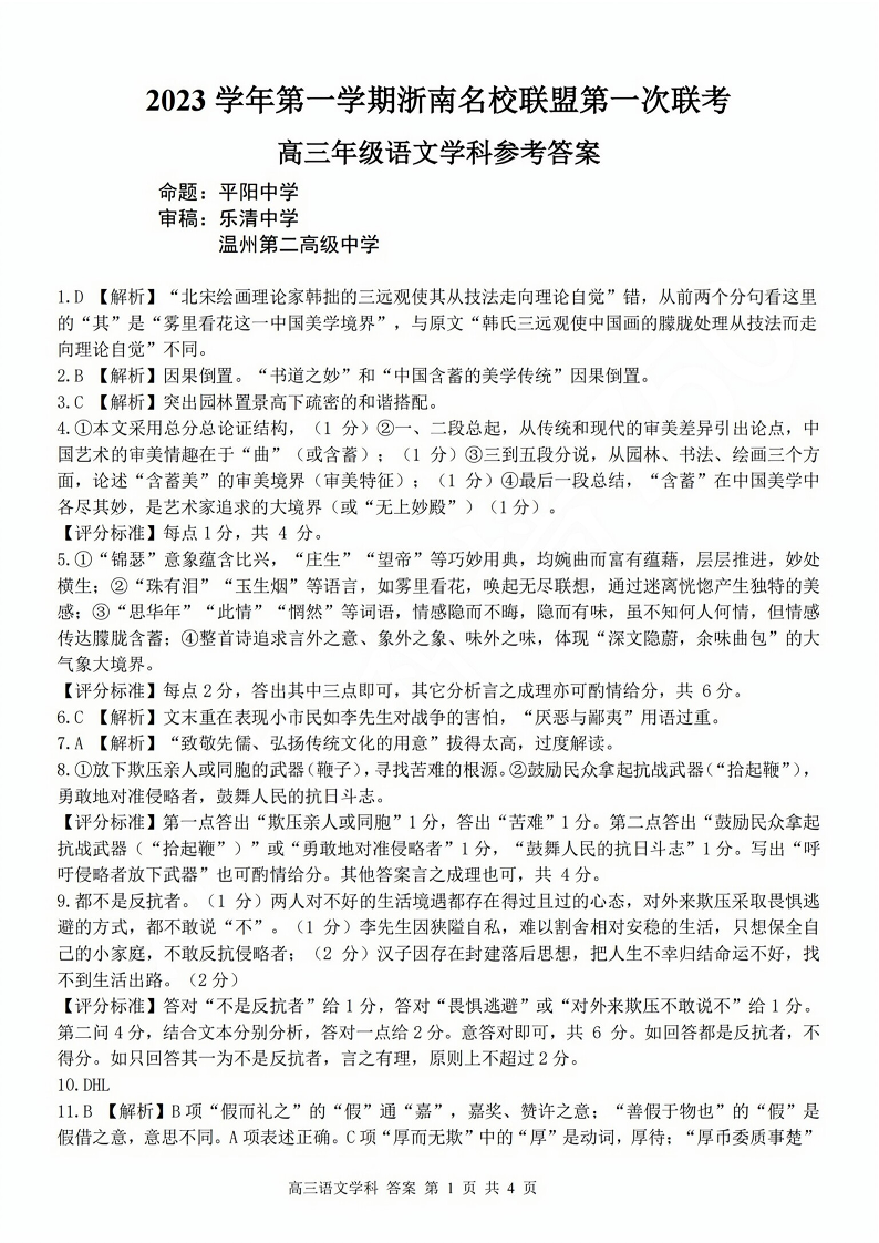 高三年级语文学科参考答案