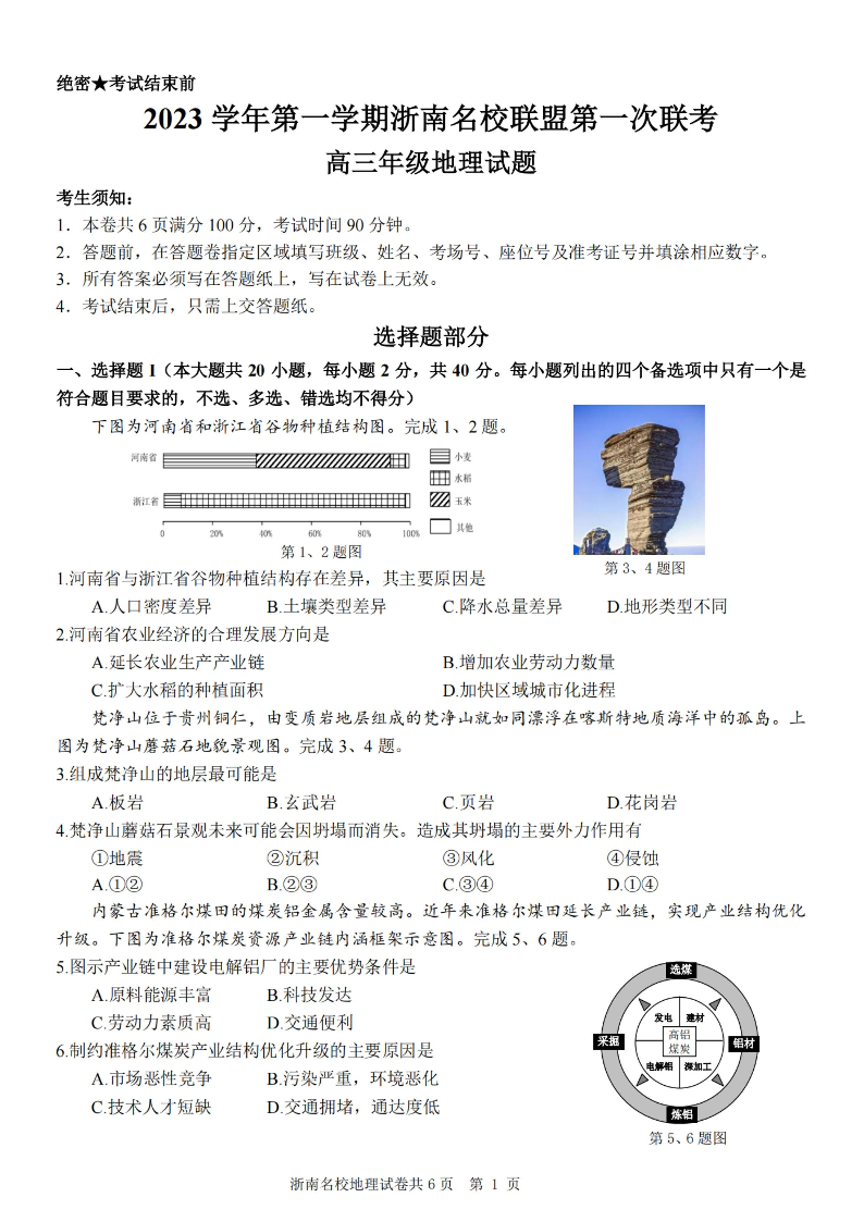 浙江省浙南名校联盟2023-2024学年高三上学期第一次联考 地理