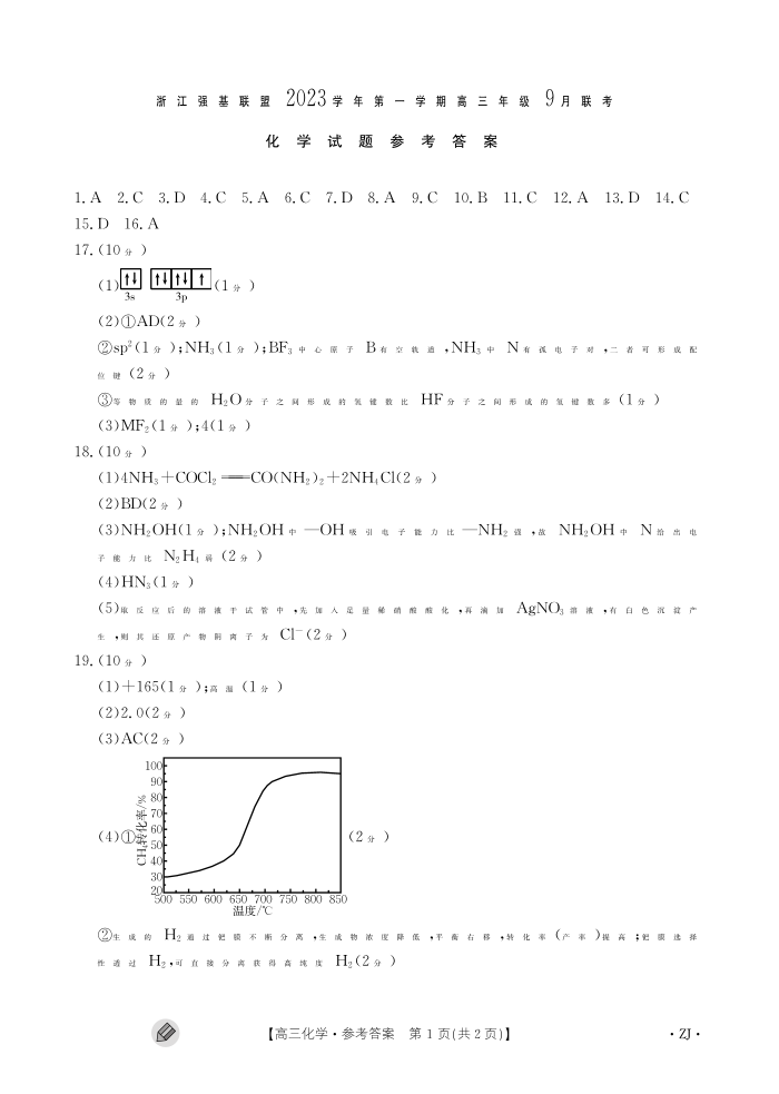 浙江强基联盟2023学年第一学期高三年级9月联考 化学答案