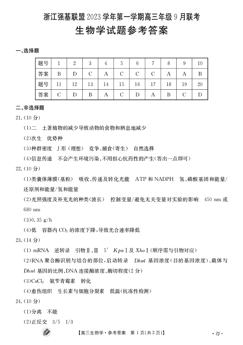 浙江强基联盟2023学年第一学期高三年级9月联考 生物答案