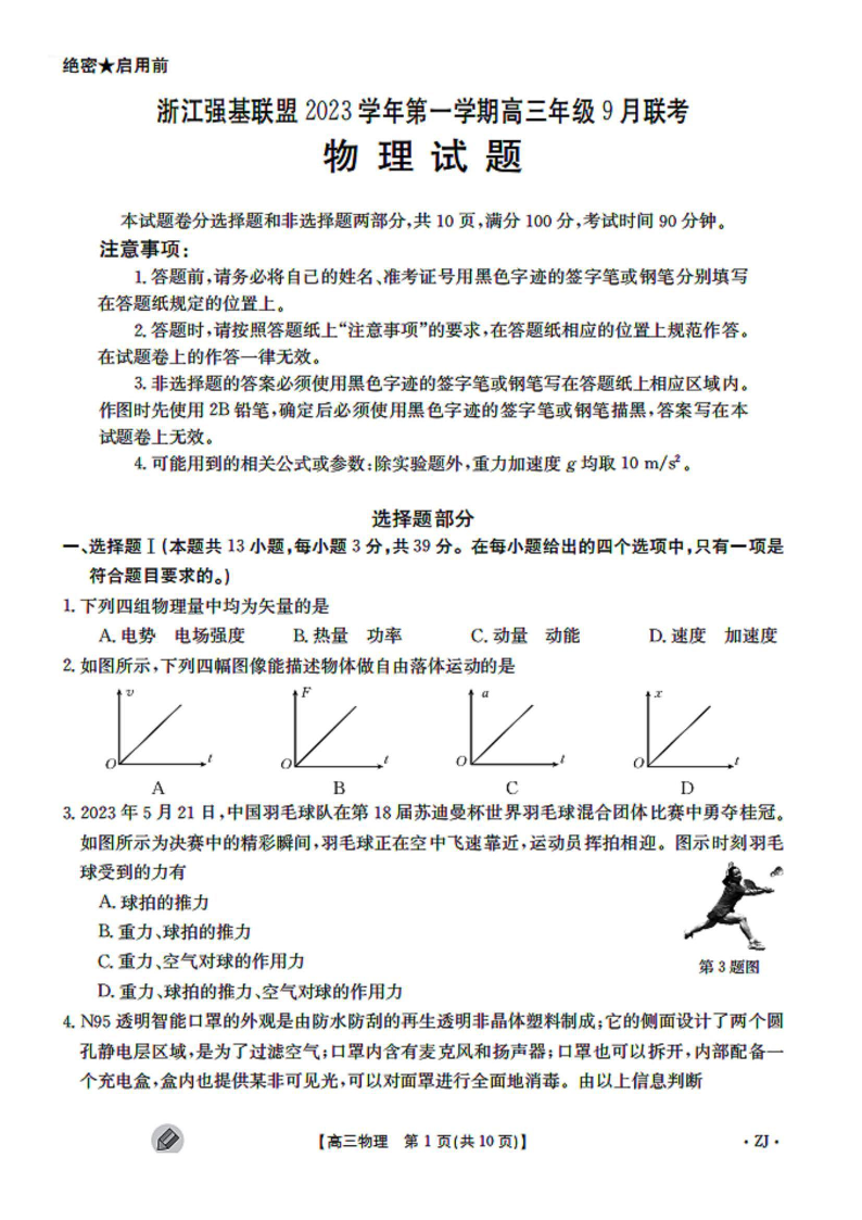 浙江强基联盟2023学年第一学期高三年级9月联考 物理