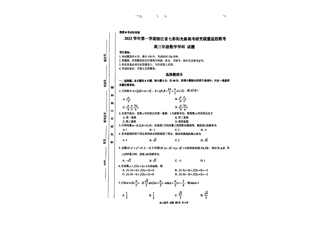 浙江省七彩阳光新高考研究联盟2023-2024学年高三上学期返校联考 数学