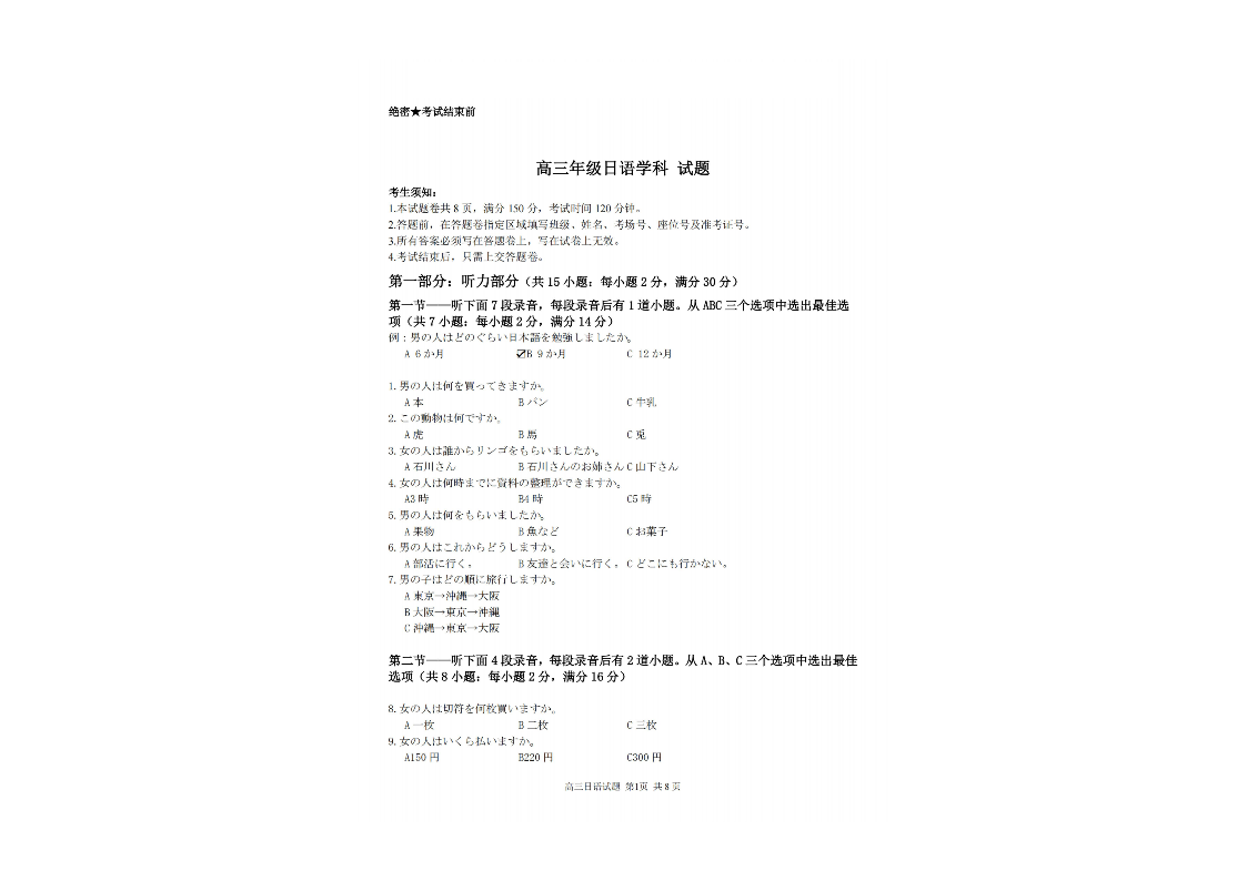 浙江省七彩阳光新高考研究联盟2023-2024学年高三上学期返校联考 日语