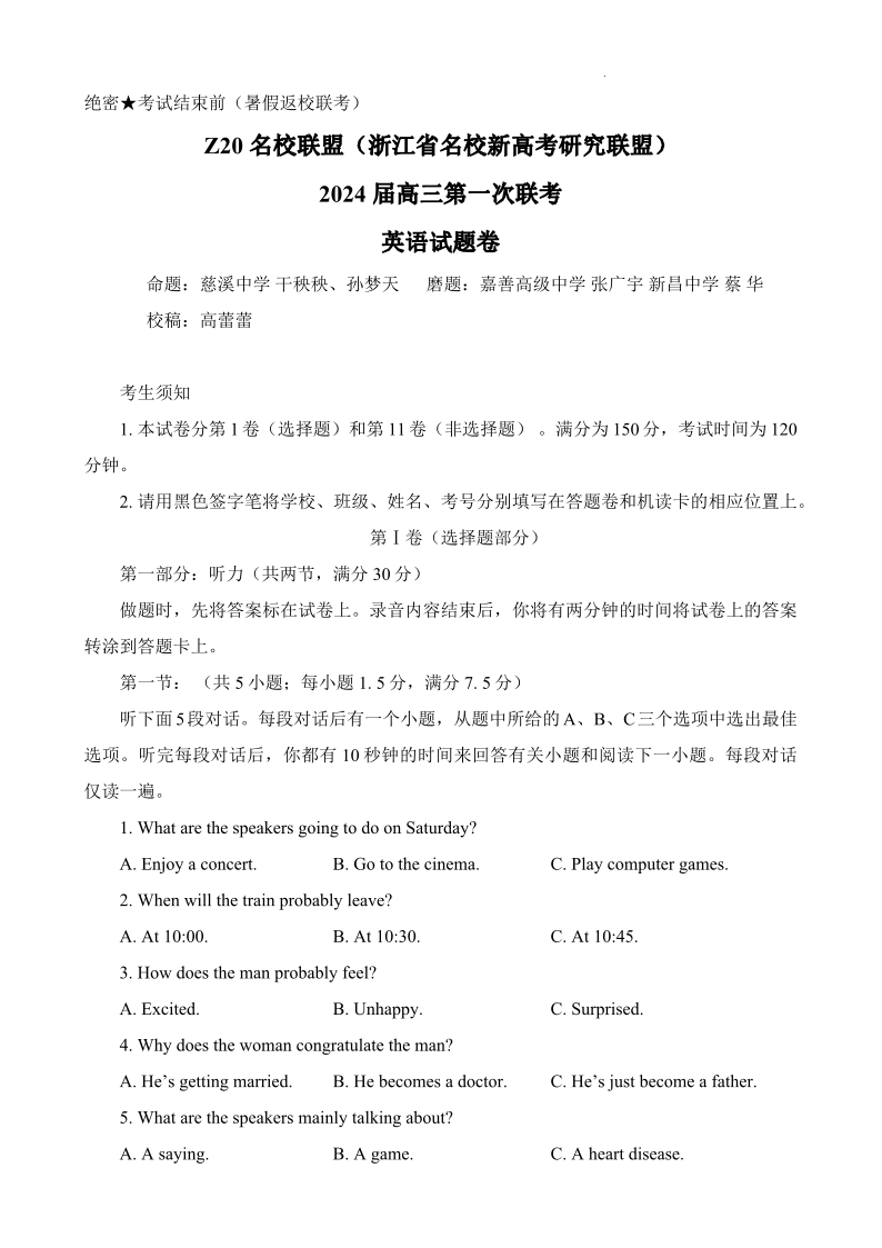 2024届Z20名校联盟(浙江省名校新高考研究联盟)高三第一次联考 英语