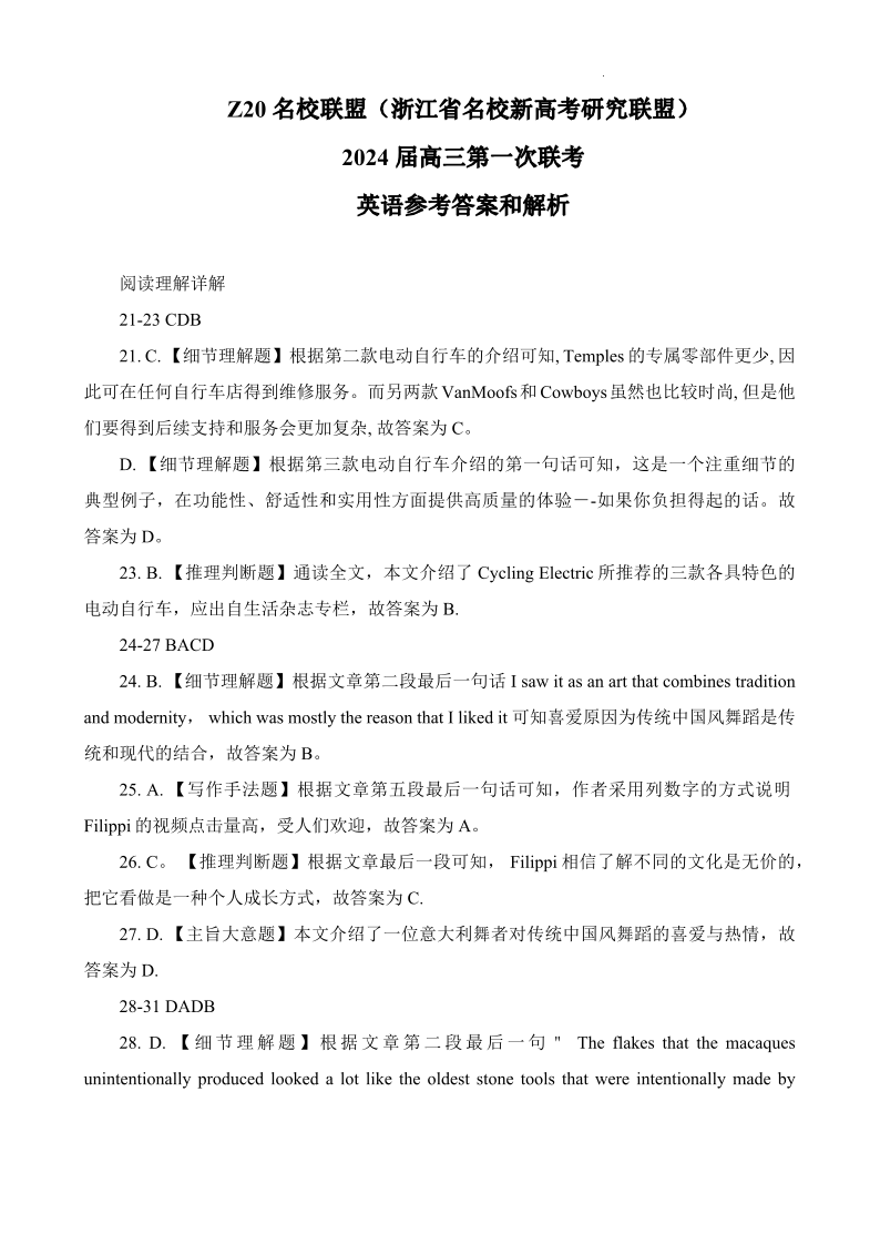 2024届Z20名校联盟(浙江省名校新高考研究联盟)高三第一次联考 英语答案