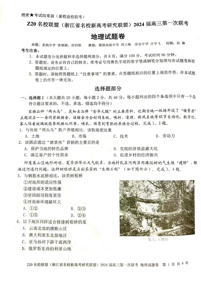 2024届Z20名校联盟(浙江省名校新高考研究联盟)高三第一次联考 地理