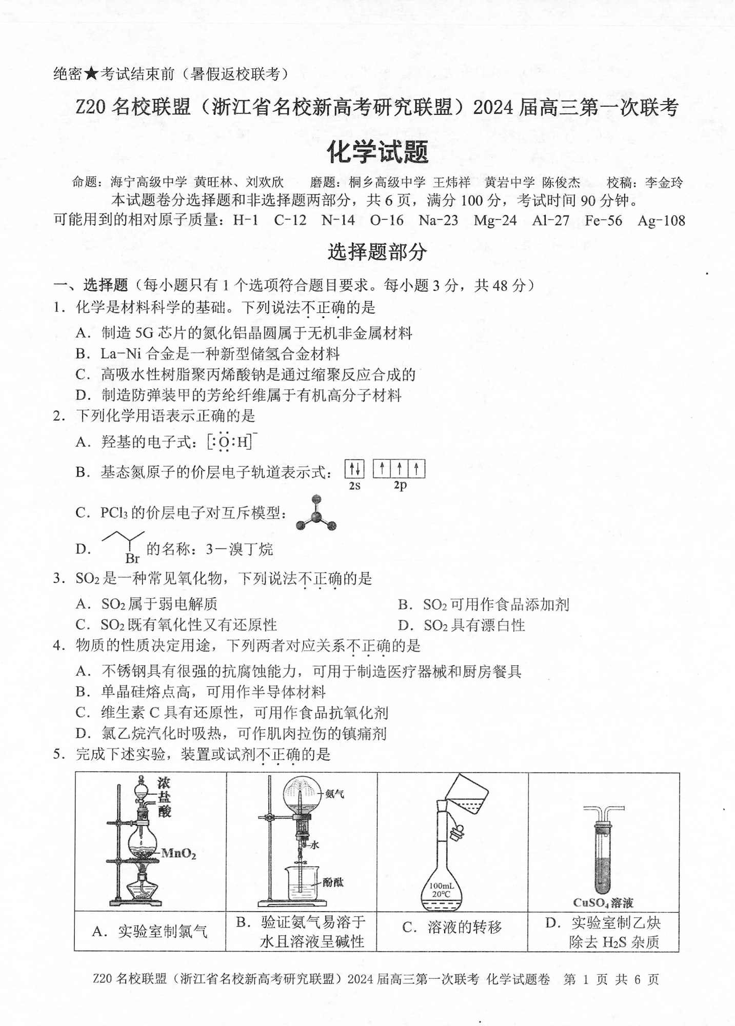 2024届Z20名校联盟(浙江省名校新高考研究联盟)高三第一次联考 化学