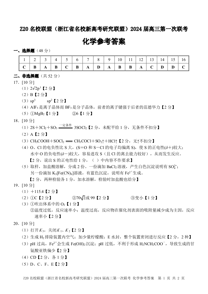 2024届Z20名校联盟(浙江省名校新高考研究联盟)高三第一次联考 化学答案