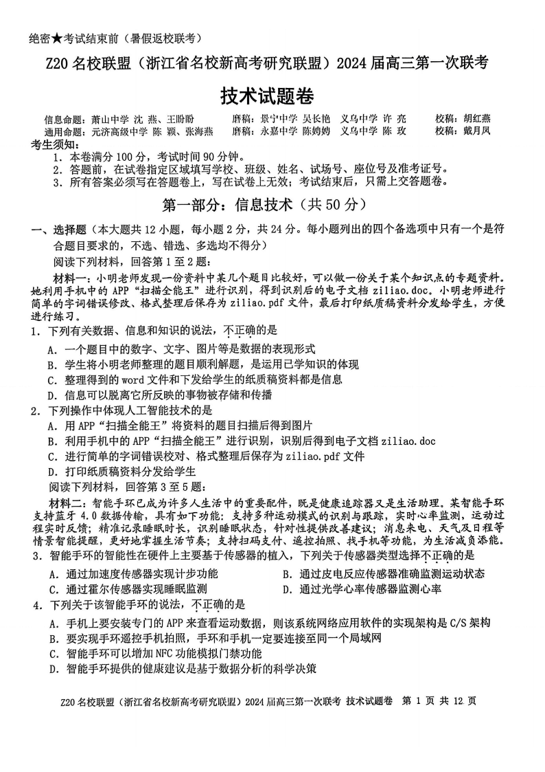 2024届Z20名校联盟(浙江省名校新高考研究联盟)高三第一次联考 技术