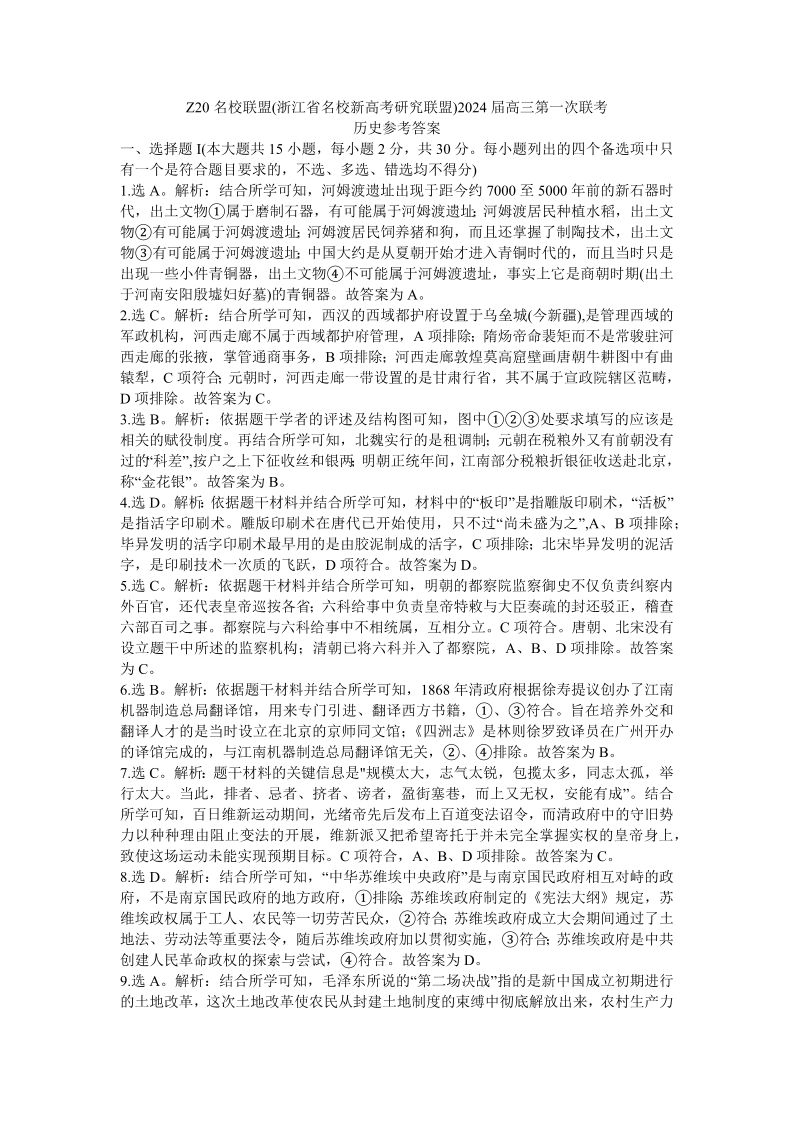 2024届Z20名校联盟(浙江省名校新高考研究联盟)高三第一次联考 历史答案