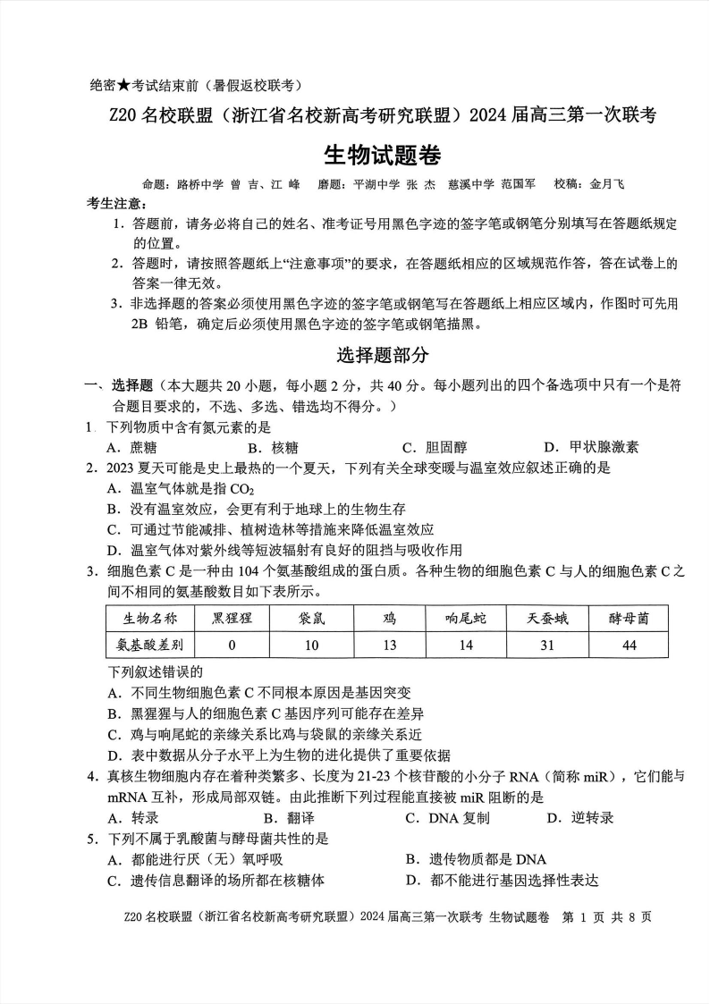2024届Z20名校联盟(浙江省名校新高考研究联盟)高三第一次联考 生物