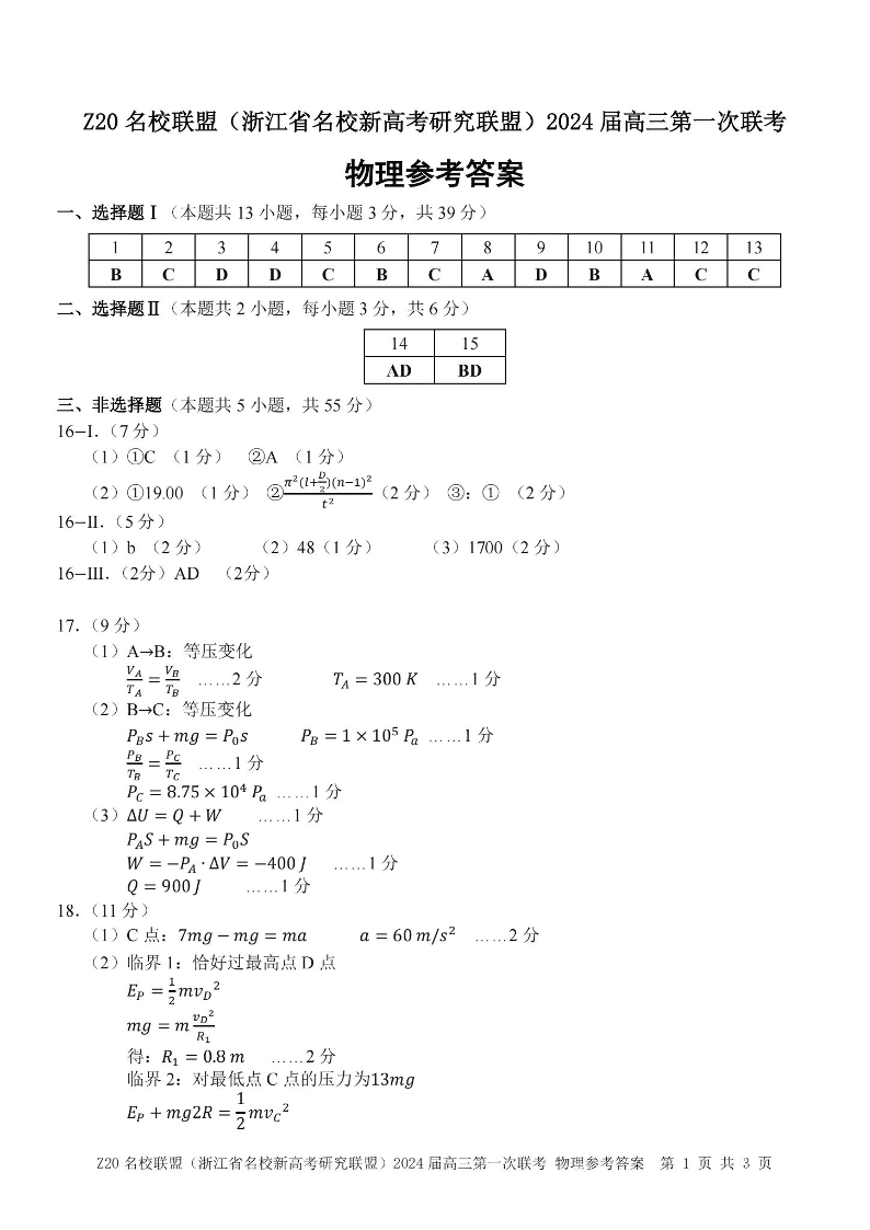 2024届Z20名校联盟(浙江省名校新高考研究联盟)高三第一次联考 物理答案