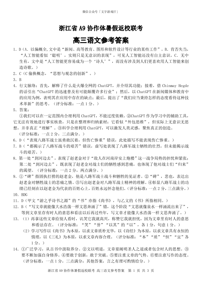 浙江省A9协作体2023-2024学年高三暑假返校联考 语文答案