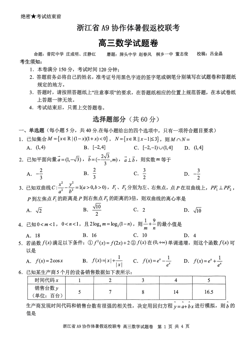 浙江省A9协作体2023-2024学年高三暑假返校联考 数学