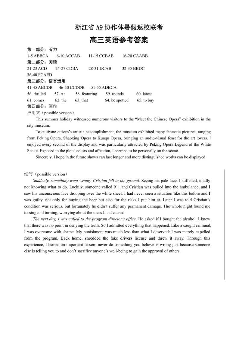 浙江省A9协作体2023-2024学年高三暑假返校联考 英语答案