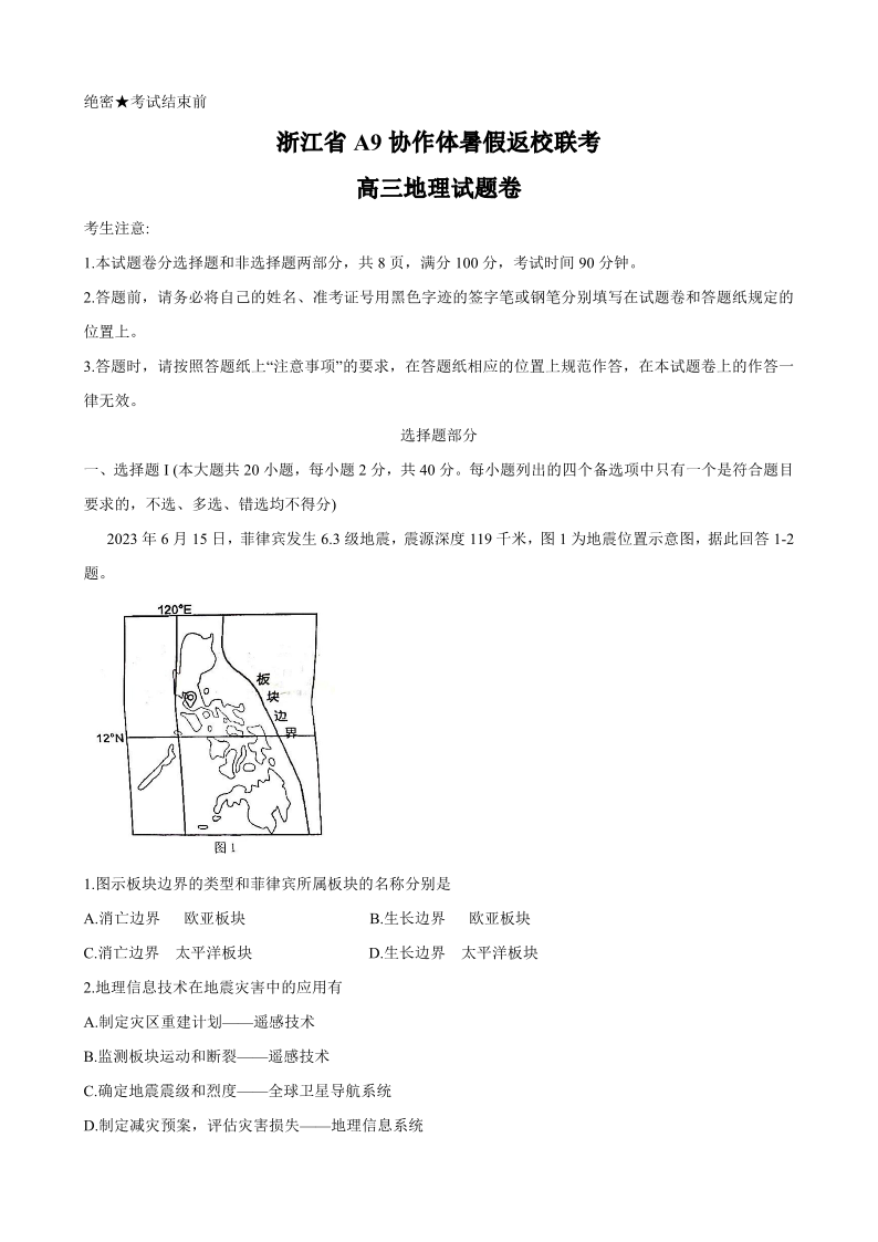 浙江省A9协作体2023-2024学年高三暑假返校联考 地理