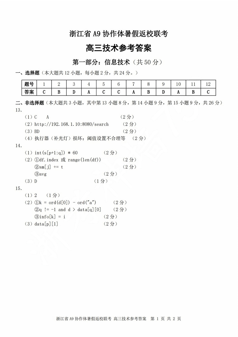浙江省A9协作体2023-2024学年高三暑假返校联考 技术答案