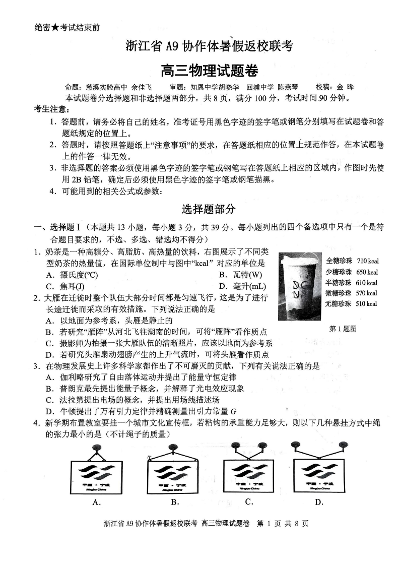 浙江省A9协作体2023-2024学年高三暑假返校联考 物理