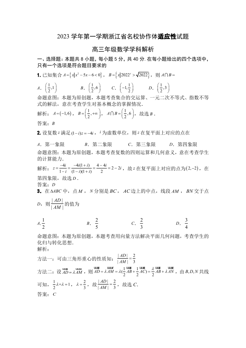 浙江省名校协作体2023-2024学年高三上学期开学适应性考试 数学答案