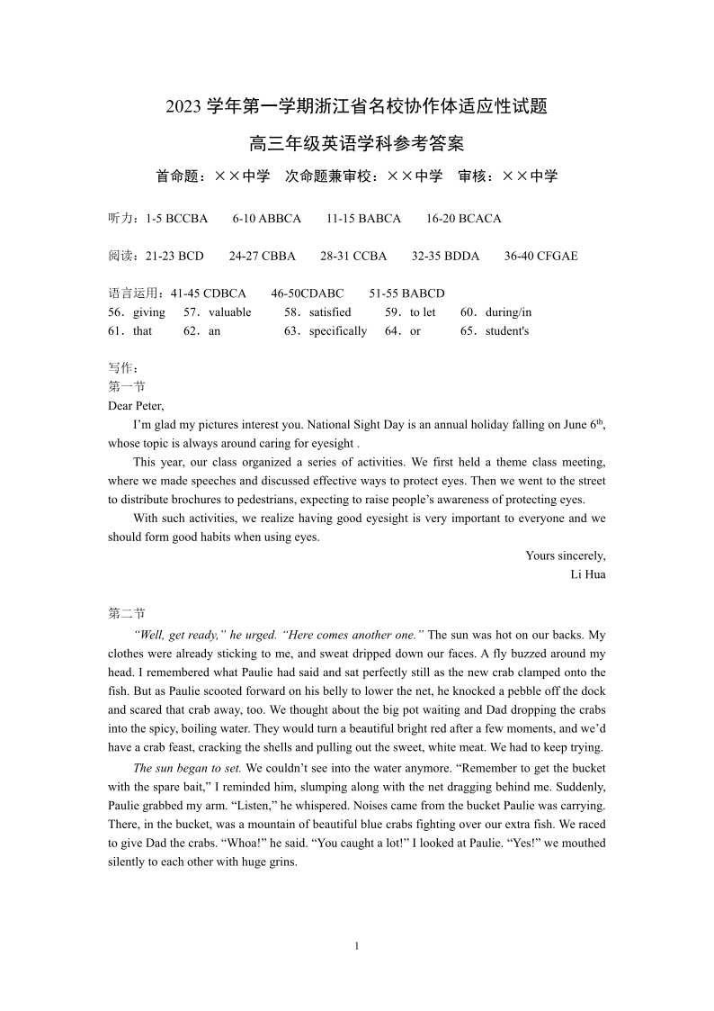 浙江省名校协作体2023-2024学年高三上学期开学适应性考试 英语答案