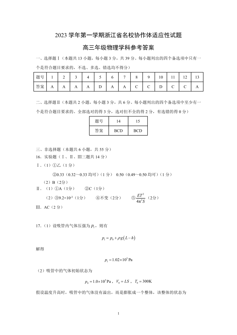 浙江省名校协作体2023-2024学年高三上学期开学适应性考试 物理答案