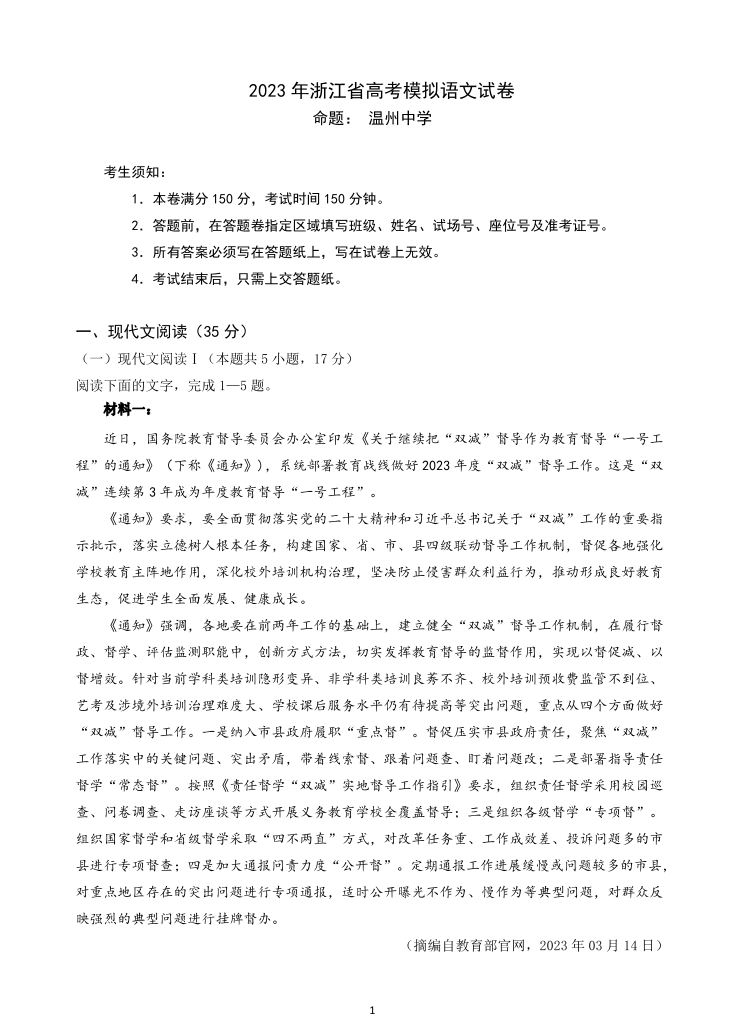 2023年浙江省高考四校联盟高三模拟卷 语文