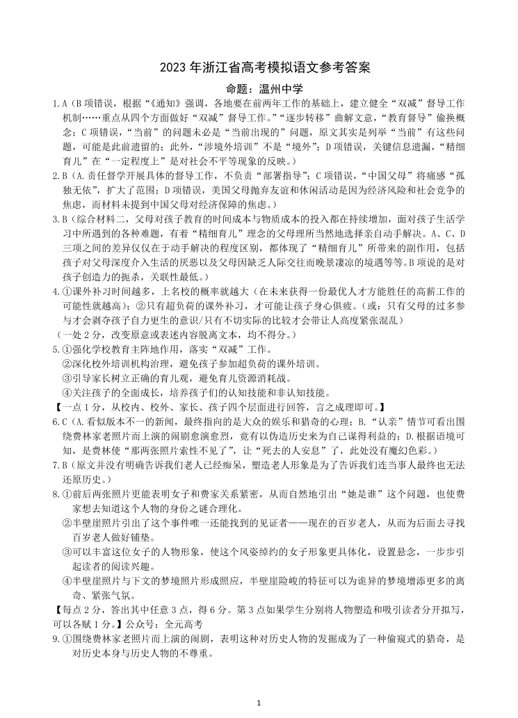 2023年浙江省高考四校联盟高三模拟卷 语文答案