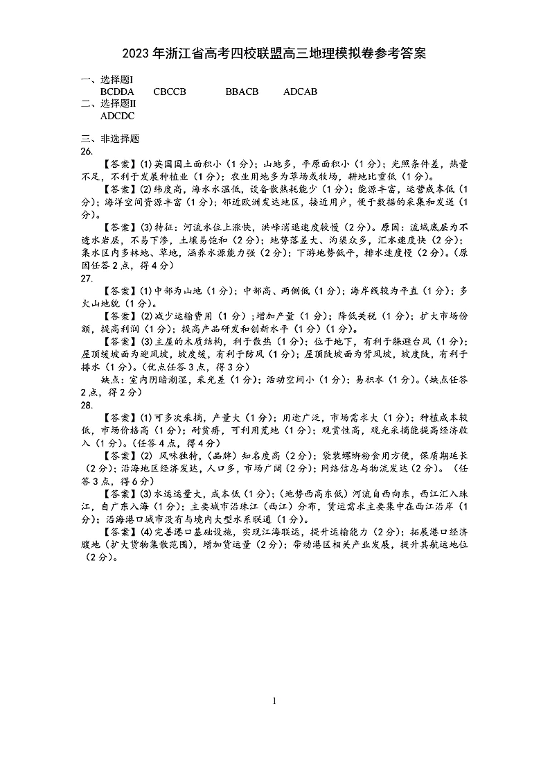 2023年浙江省高考四校联盟高三模拟卷 地理答案