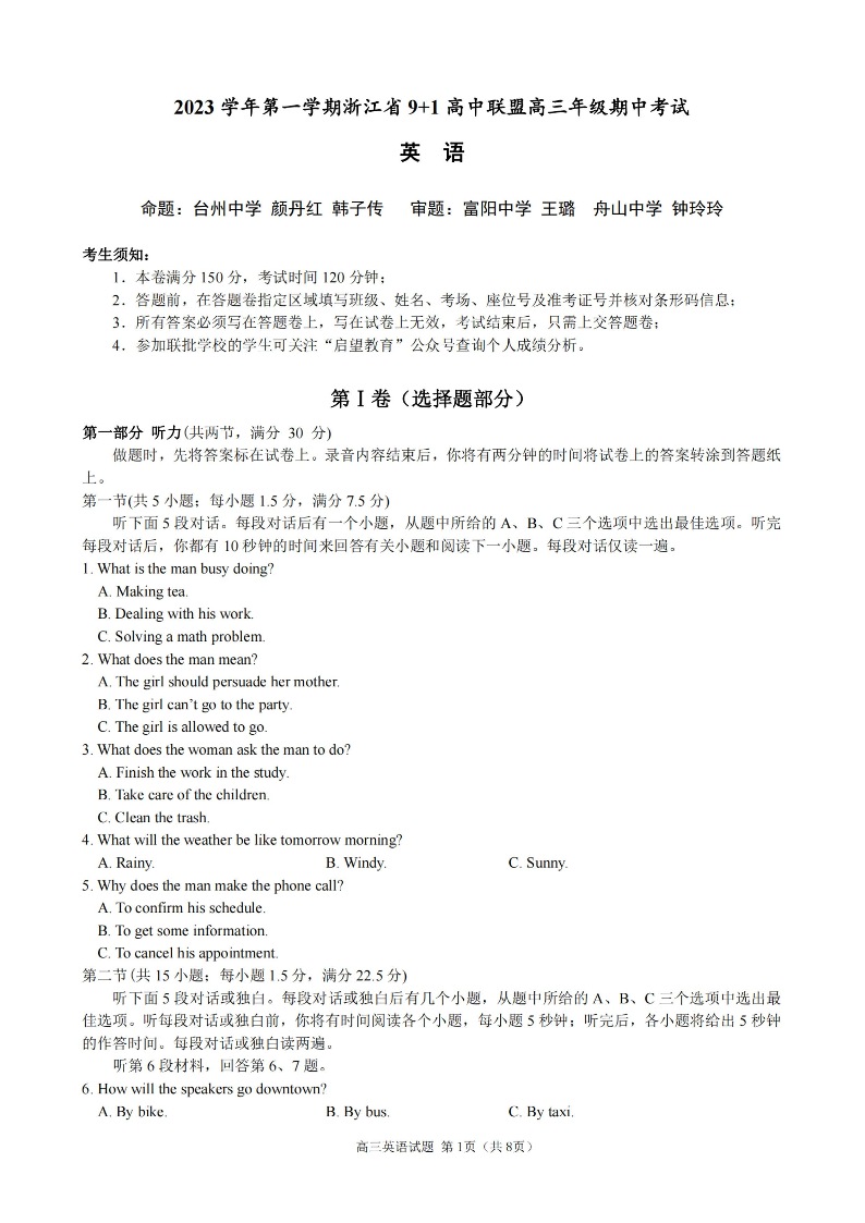 浙江省9+1高中联盟2023-2024学年高三上学期期中联考 英语