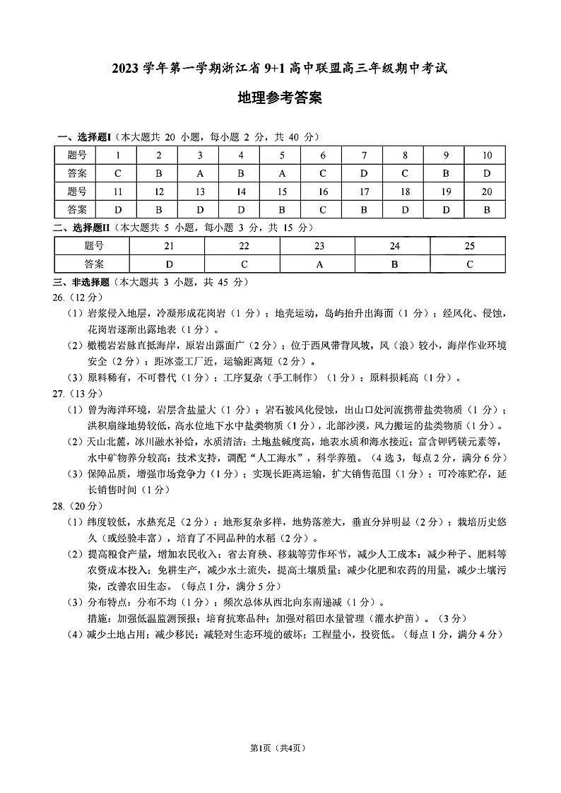 浙江省9+1高中联盟2023-2024学年高三上学期期中联考 地理参考答案
