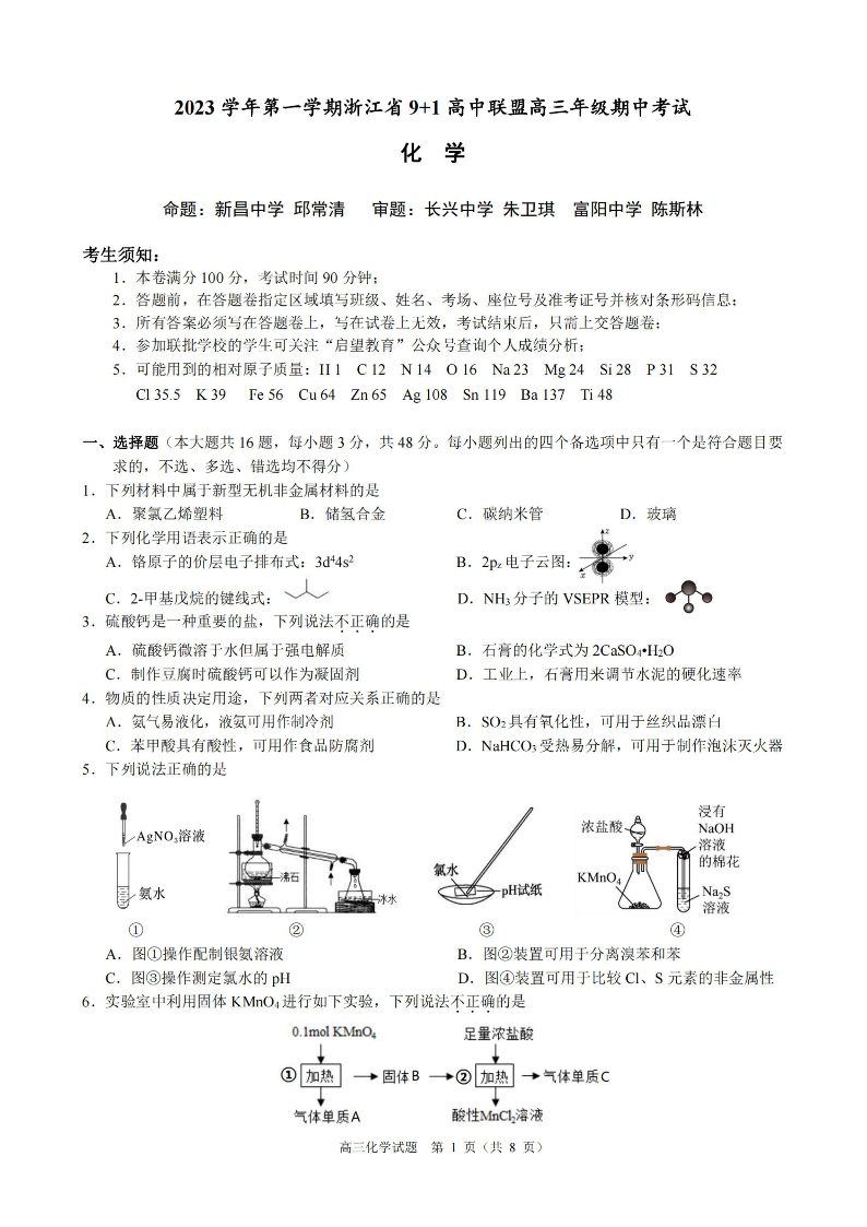 浙江省9+1高中联盟2023-2024学年高三上学期期中联考 化学