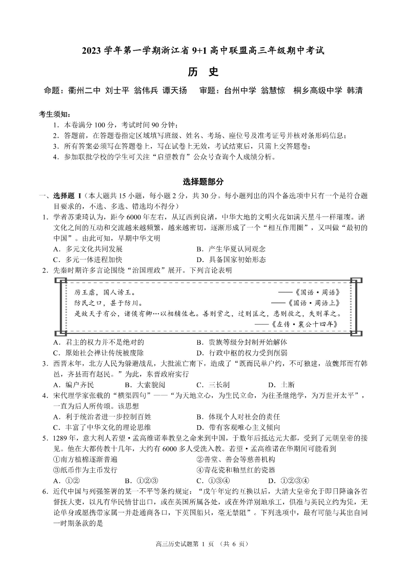 浙江省9+1高中联盟2023-2024学年高三上学期期中联考 历史