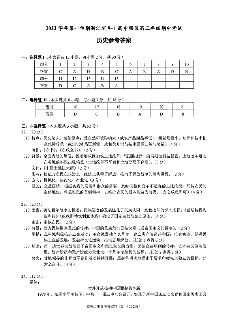 浙江省9+1高中联盟2023-2024学年高三上学期期中联考 历史参考答案