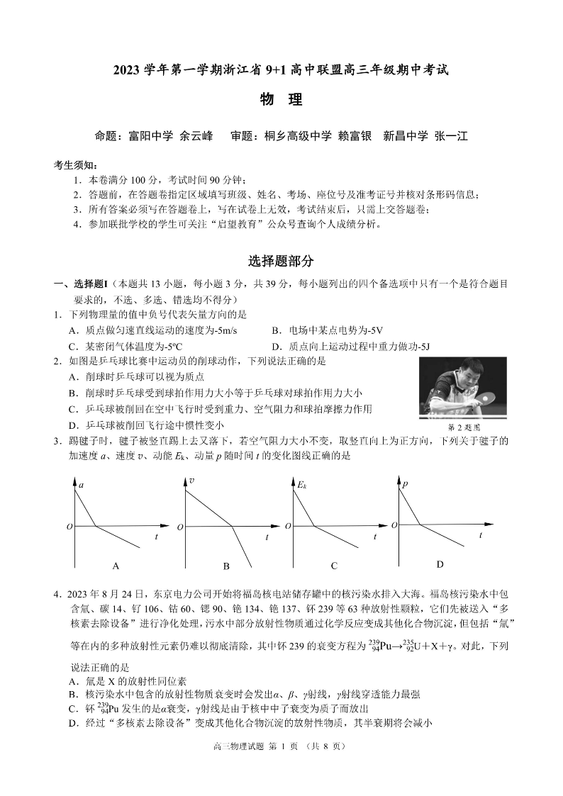浙江省9+1高中联盟2023-2024学年高三上学期期中联考 物理