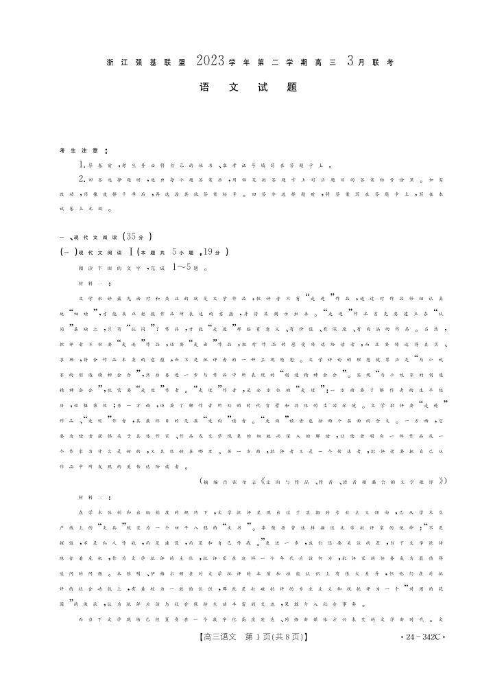 浙江省强基联盟2023-2024学年高三下学期3月联考 语文