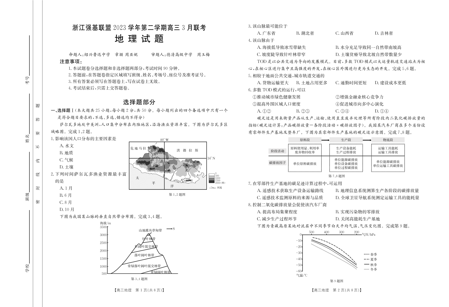 浙江省强基联盟2023-2024学年高三下学期3月联考 地理