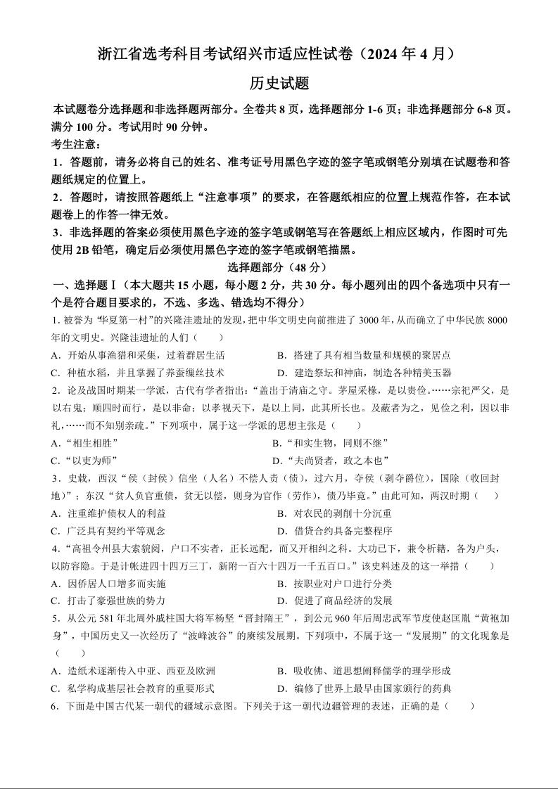 2024届浙江省绍兴市高三高考4月适应性考试(二模)历史