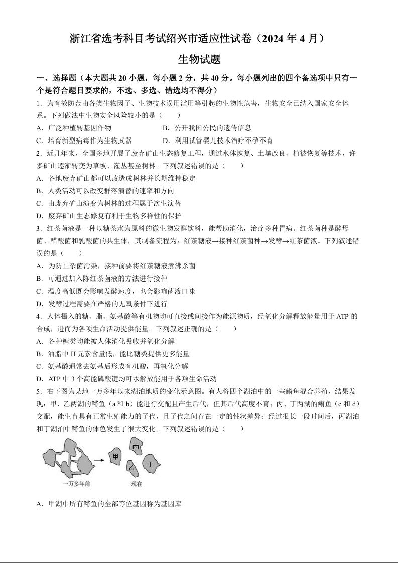 2024届浙江省绍兴市高三高考4月适应性考试(二模)生物