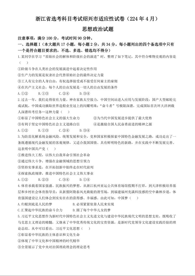 2024届浙江省绍兴市高三高考4月适应性考试(二模)政治