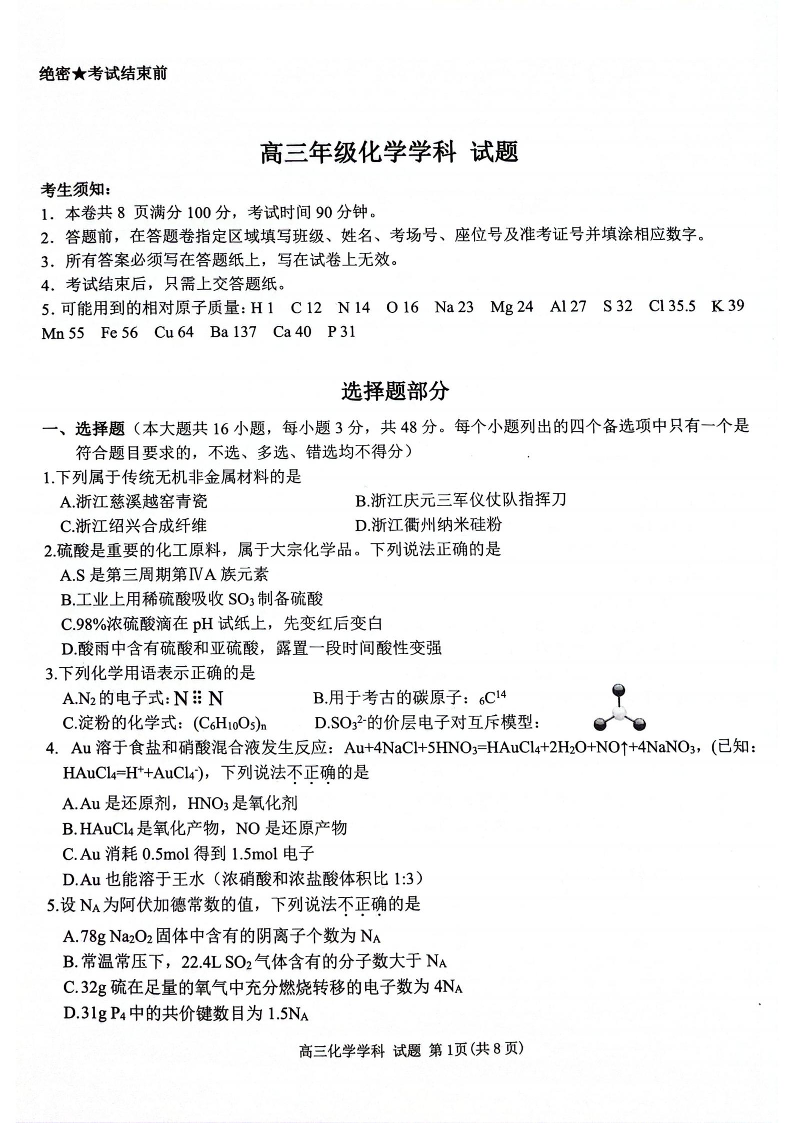 浙江省北斗星盟2024届高三下学期5月适应性联考+化学