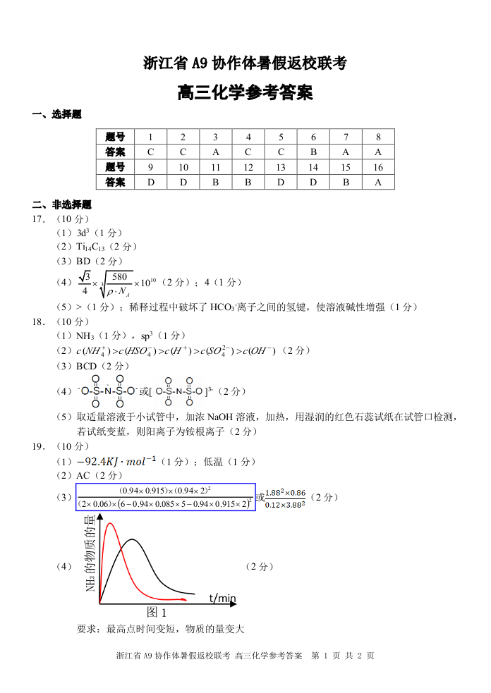 浙江省A9协作体2025届2024年8月高三年级八月暑期返校联考+化学答案