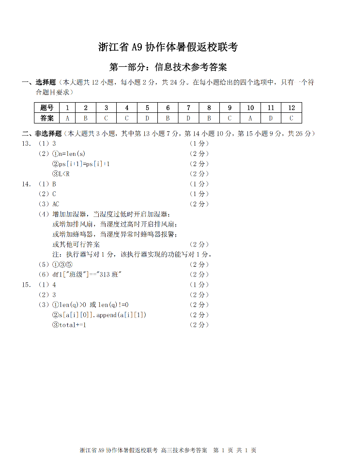 浙江省A9协作体2025届2024年8月高三年级八月暑期返校联考+技术试卷-信息技术答案