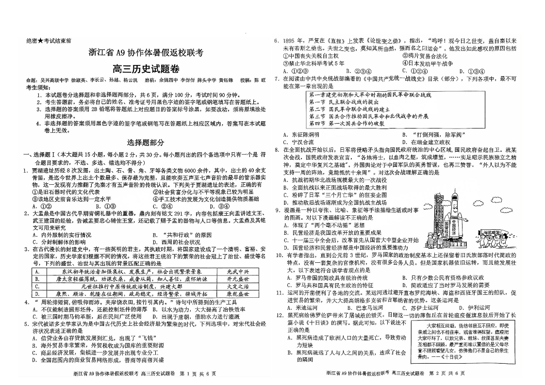 浙江省A9协作体2025届2024年8月高三年级八月暑期返校联考+历史
