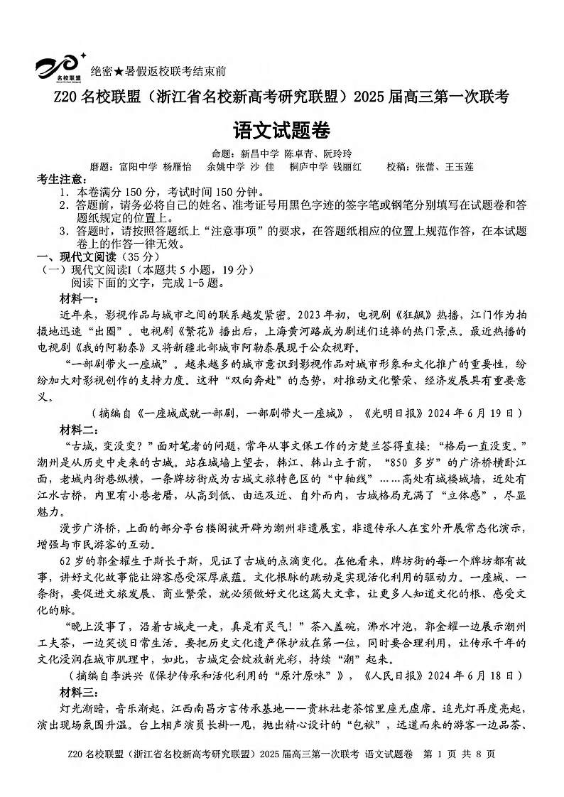 浙江省Z20名校联盟(浙江省名校新高考研究联盟)2025届高三第一次联考+语文