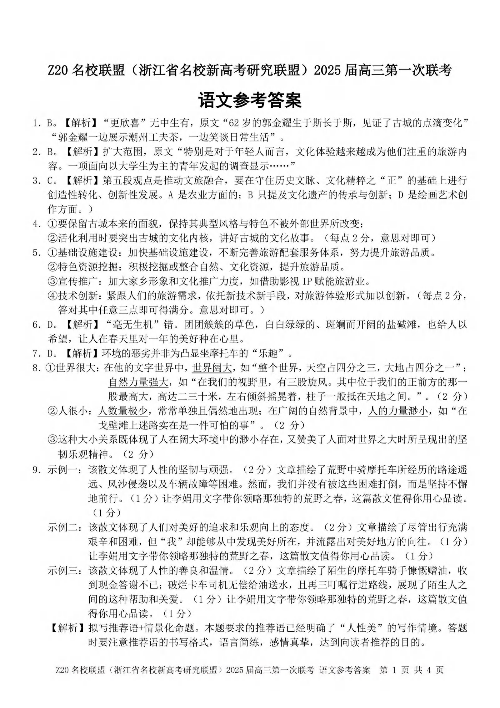 浙江省Z20名校联盟(浙江省名校新高考研究联盟)2025届高三第一次联考+语文答案