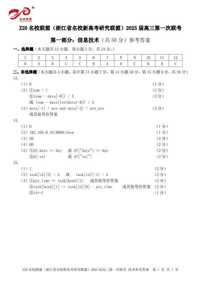 浙江省Z20名校联盟(浙江省名校新高考研究联盟)2025届高三第一次联考+技术答案