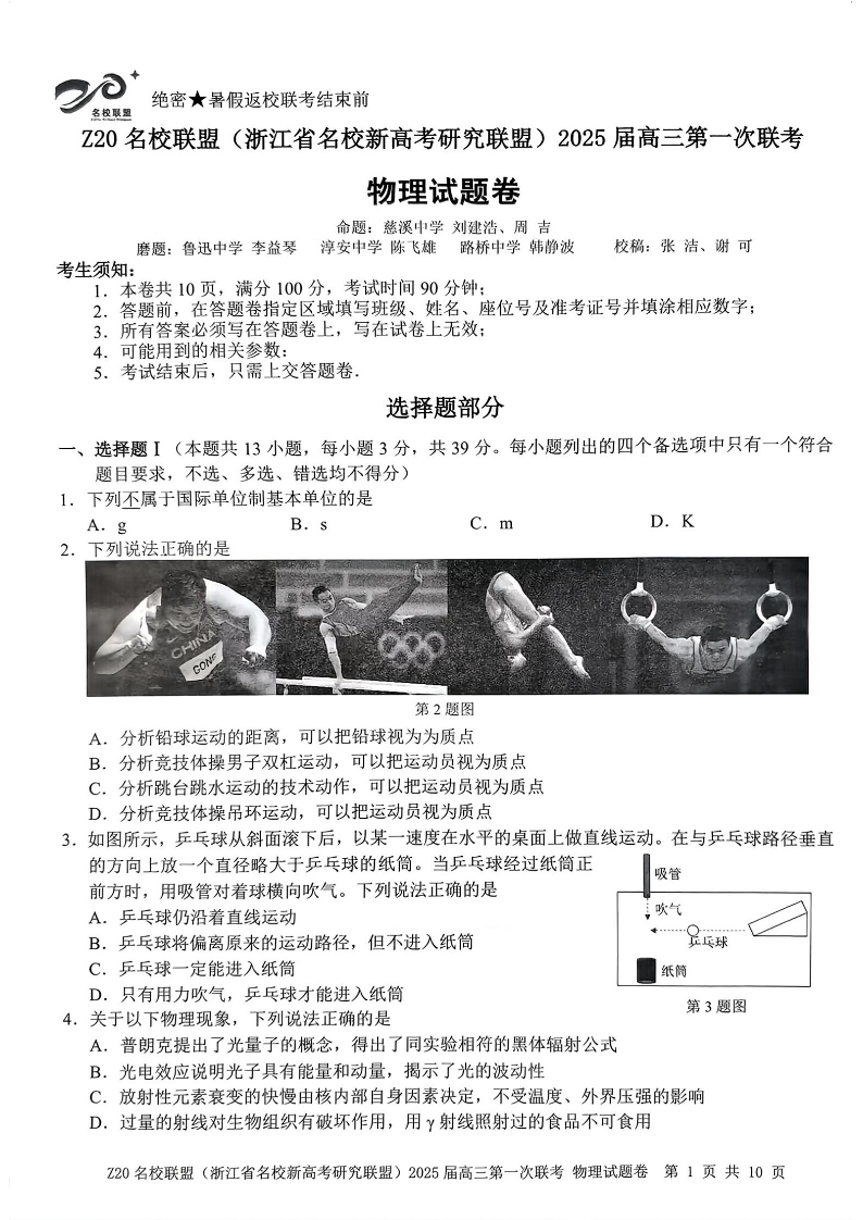 浙江省Z20名校联盟(浙江省名校新高考研究联盟)2025届高三第一次联考+物理