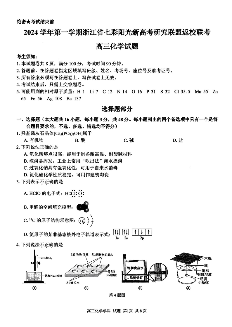 2024学年第一学期浙江省七彩阳光新高考研究联盟返校联考+化学