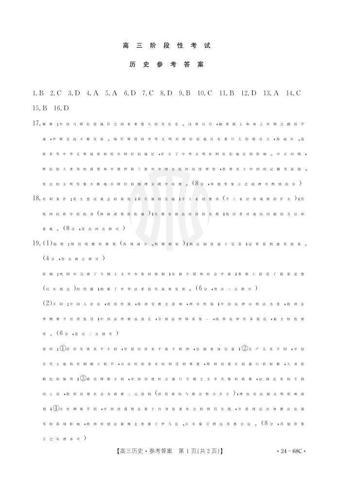 2024届江苏广东福建高三金太阳10月百万大联考 历史答案