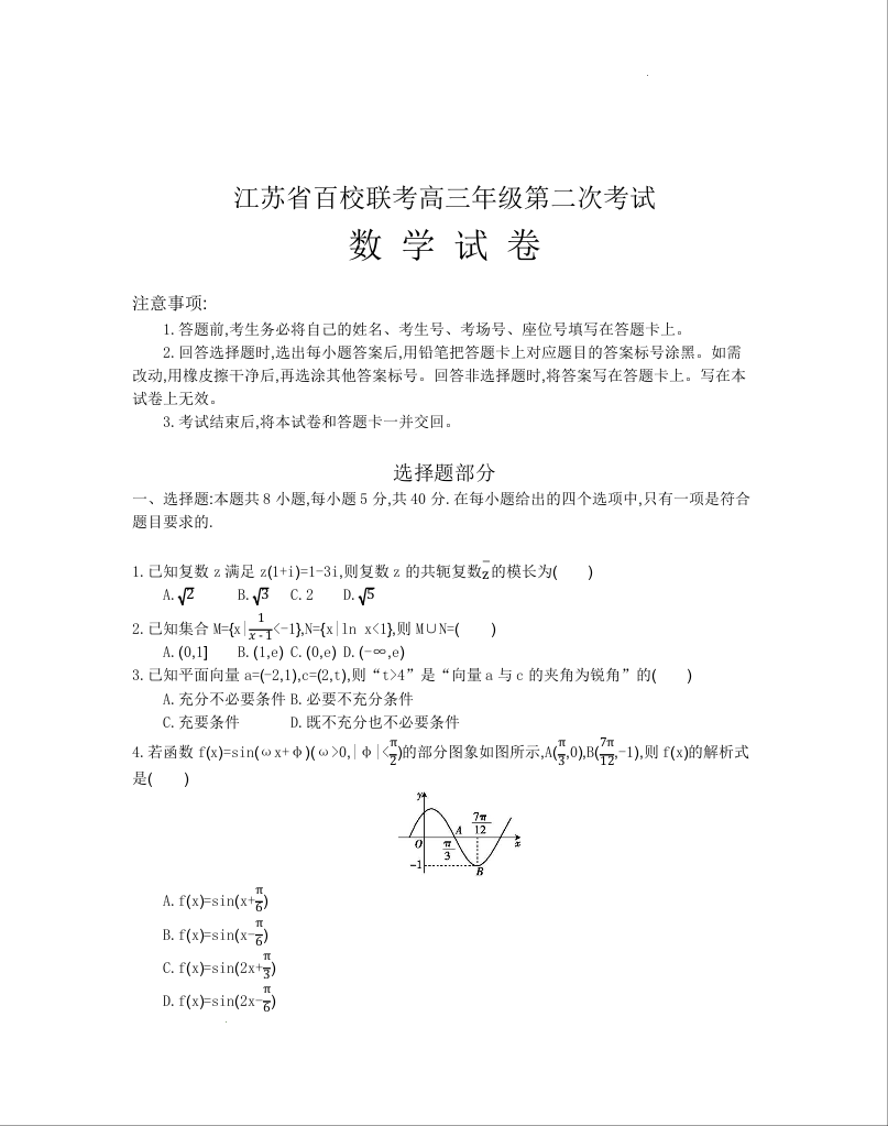 2024届江苏省百校大联考高三上学期第二次模拟预测考试 数学